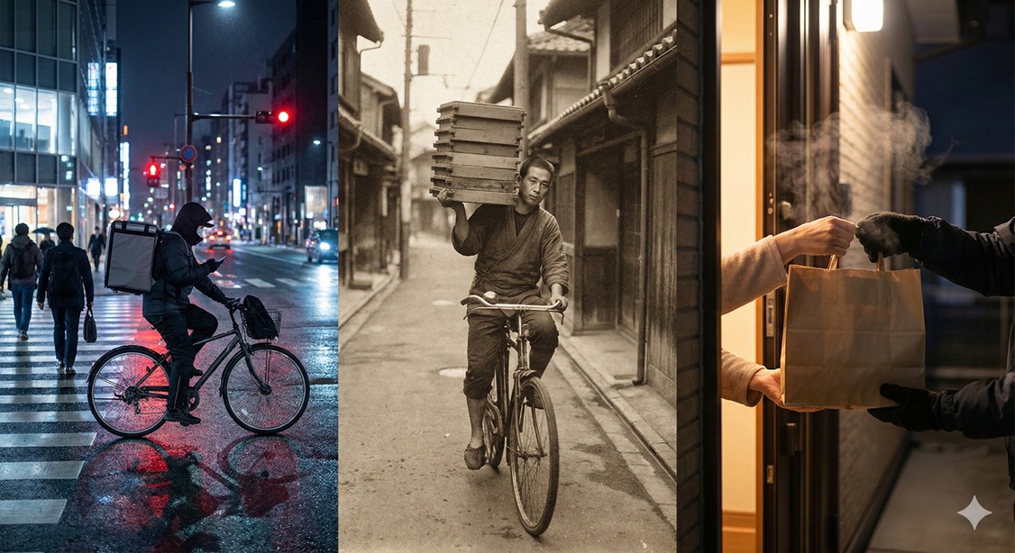 師走の風が冷たさを増す中、街を行き交う自転車の姿が目に留まる。背負われた大きな四角いリュックサック。黒や緑、鮮やかな赤。信号待ちの交差点で、スマートフォンを指でなぞる彼らの姿は、いまや都市の風景の一部として完全に溶け込んだ。かつては特別な日の贅沢だった「出前」が、指先一つで日常の食事へと変わって久しい。