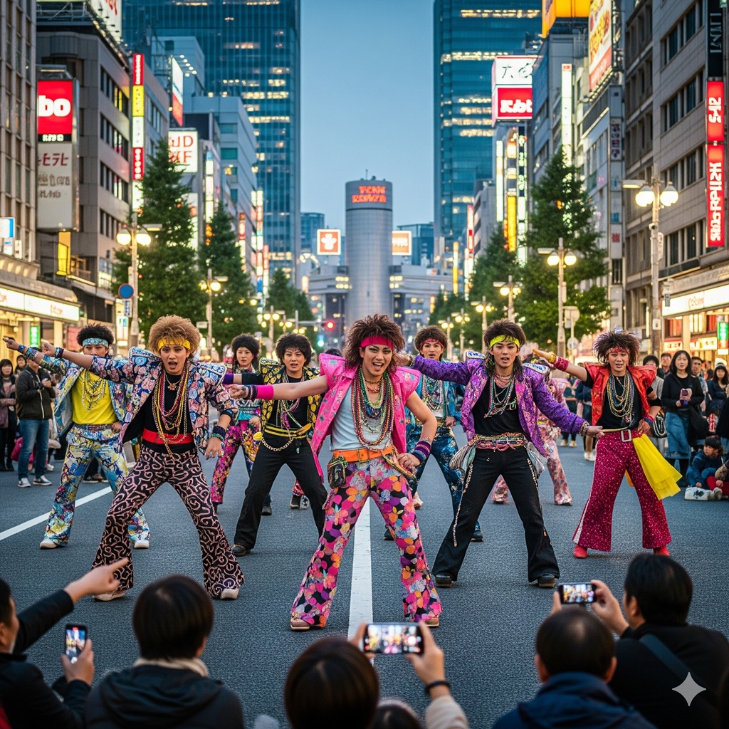 本日未明、新宿アルタ前にて、80年代に一世を風靡した伝説のストリート族「タケノコ族」が突如として大集結しました。原宿の歩行者天国で竹の子のように次々と人が集まったことからその名がついた彼らは、原色ド派手な衣装をまとい、ラジカセから流れる音楽に合わせて独特のダンスを踊ることで知られています。