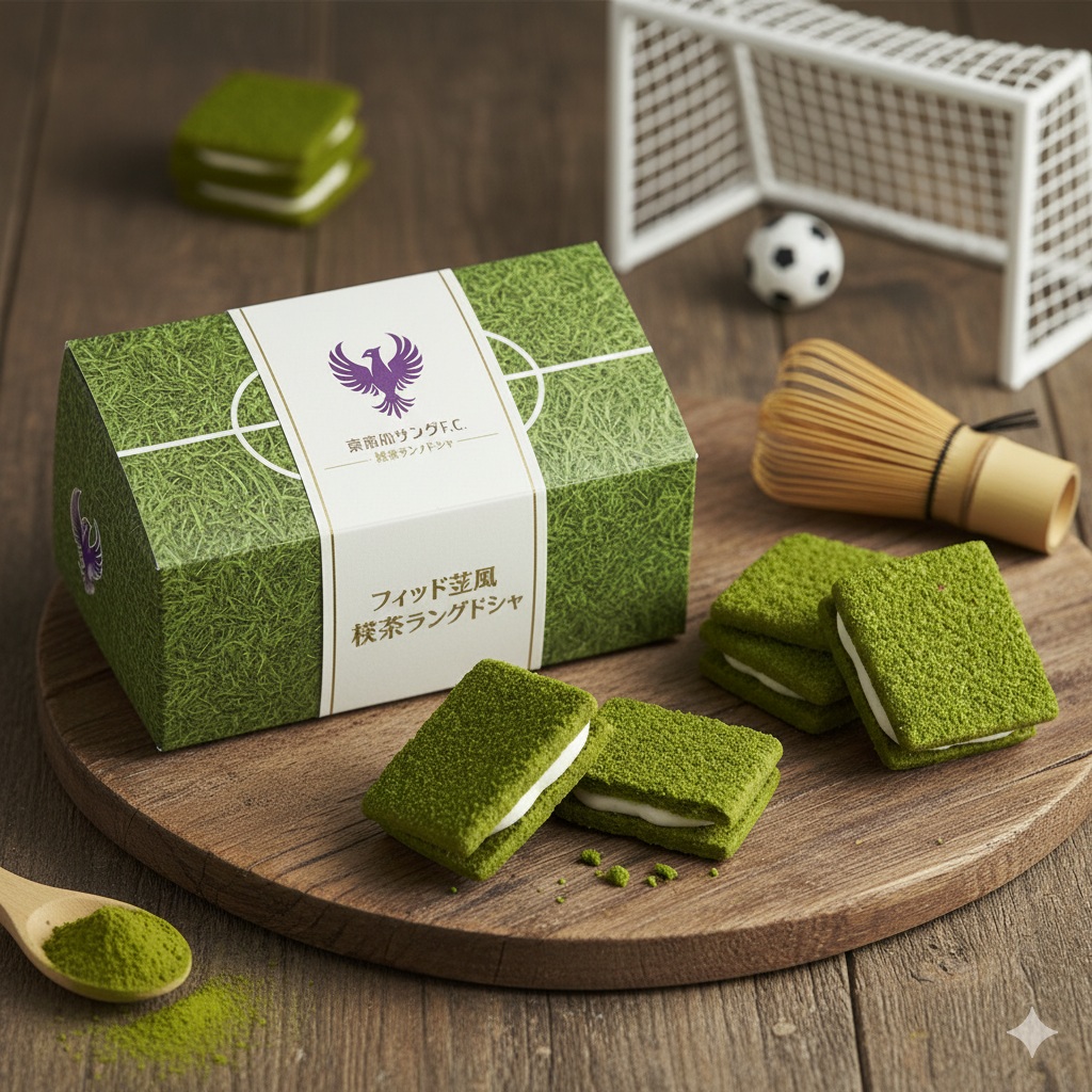 新ピッチの公開日には、来場者全員に「ピッチの芝と同じ色」を再現した抹茶色の特製パンを配布。さらに、この抹茶フィールドをモチーフにしたクラブ公式グッズとして、「フィールド芝風 抹茶ラングドシャ」や、選手が移動中に使用する「香る抹茶アロマディフューザー」の販売も決定しました。