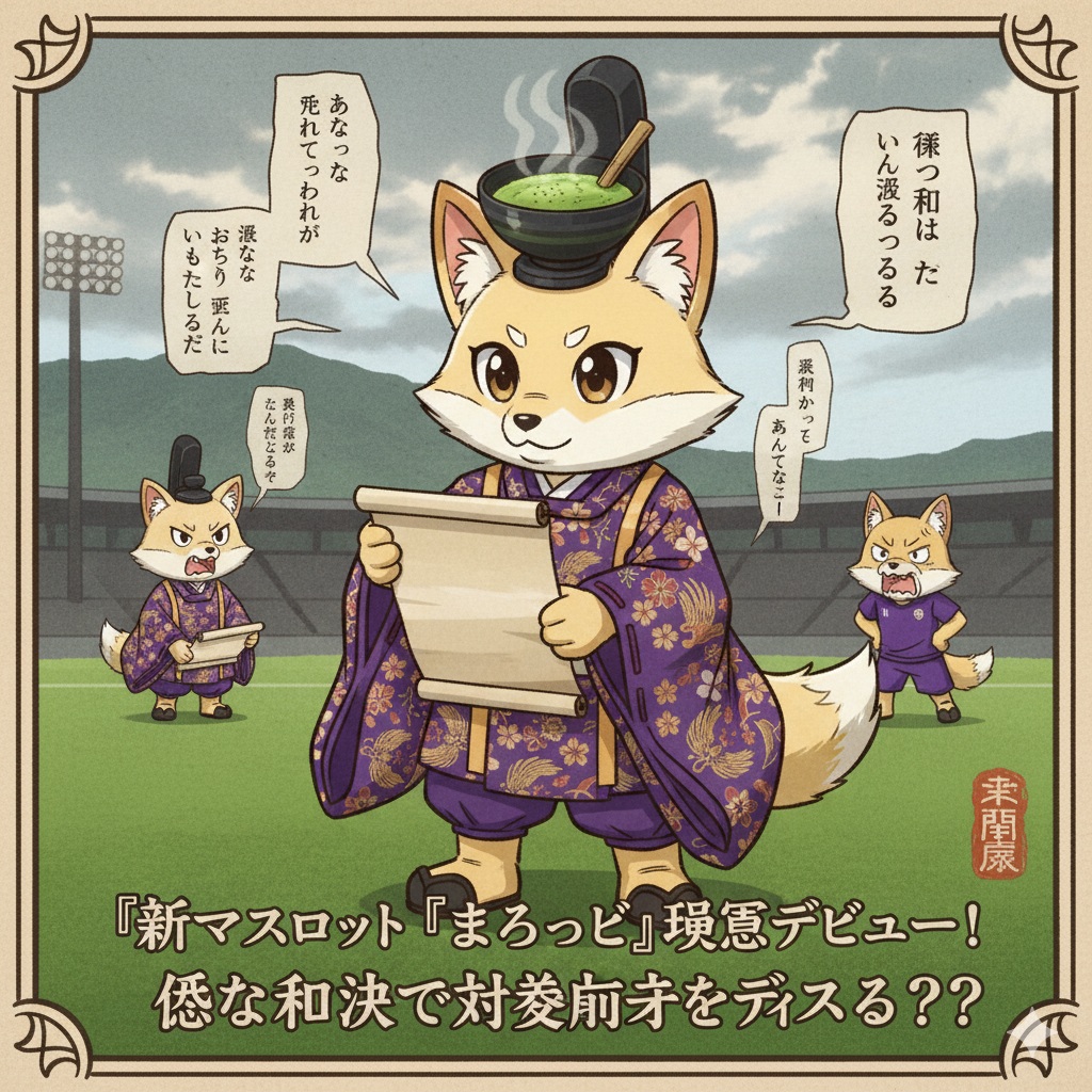 名前は「まろっぺ」。平安貴族の装束をまとったキツネがモチーフで、頭には常に「お抹茶」が乗っています。その設定は「雅(みやび)な雰囲気を保ちつつ、相手チームを和歌でディスる」というもので、既存のマスコット「パーサ」や「コトノ」との間で、キャラクターの立ち位置を巡る「仁義なき戦い」が勃発する可能性も指摘されています。