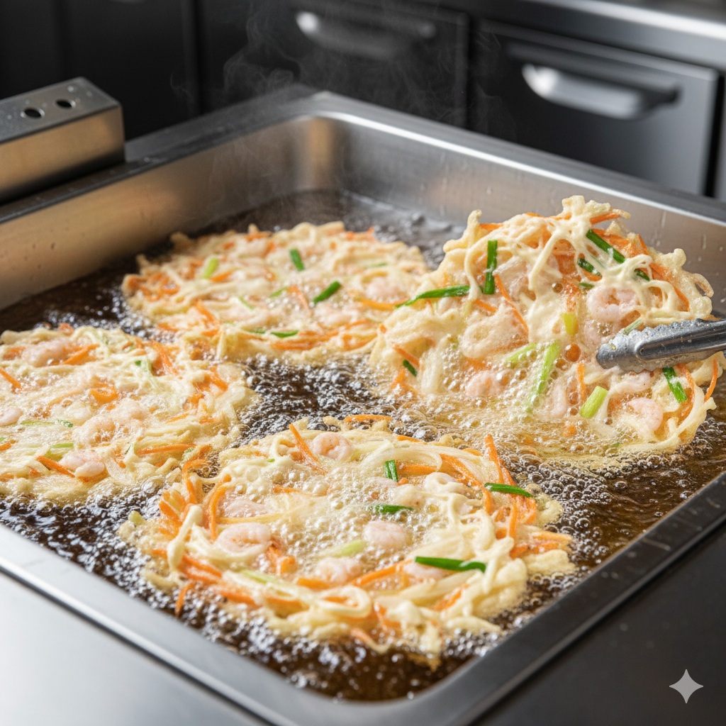 揚げ始めると、マヨネーズ特有の酸味が飛び、香ばしい香り(専門用語でいう「マヨネーズ熱分解臭」)に変化します。揚がったかき揚げは、小麦粉を使ったもののように狐色になることはなく、マヨネーズに含まれる卵白質のおかげで、真っ白に近い黄金色に仕上がり、持っただけで崩れそうなほどの繊細な軽さです。