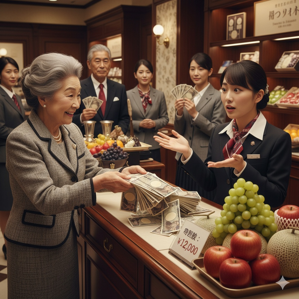 客の一人である都内在住の主婦(70代)は、このフルーツ詰め合わせを購入する際、店員に対し次のように主張した。「最高の品に、普通の値段を付けてはいけないわ。この12万円こそが、このフルーツにふさわしい特別な価格よ」。彼女は標準小売価格(15,000円)の8倍にあたる12万円を支払おうとし、店側が割引価格であることを説明しても、「最高級品にふさわしい、特別に高い値段」であると頑として譲らなかった。