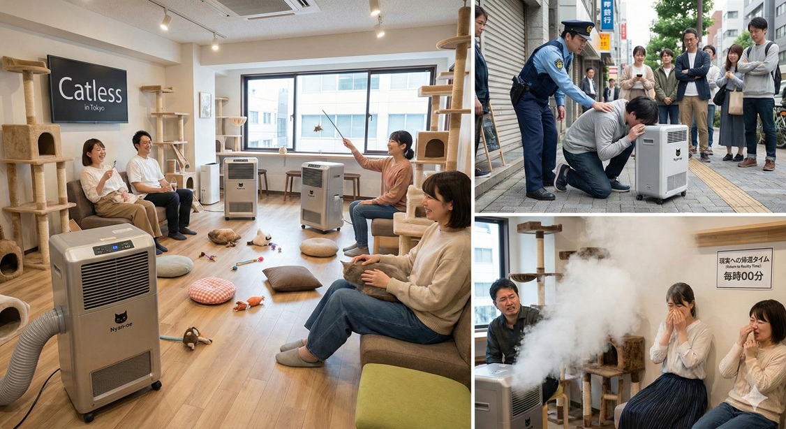 新型空気清浄機「ニャノイー」の爆発的普及に伴い、実物の猫を置かずに営業する「エア猫カフェ」が都内を中心に急増している。