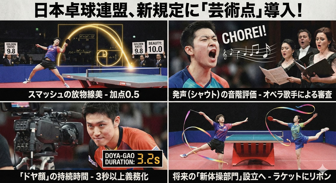 【東京・渋谷】 日本卓球連盟は14日、来年度の公式戦から新たな勝敗決定ルールとして「芸術点(アーティスティック・スコア)」を導入する方針を固めた。従来の「11点先取」という勝敗基準に加え、フィギュアスケートや体操競技のように、選手のフォームの美しさや気迫を数値化し、総合得点で競う形となる。