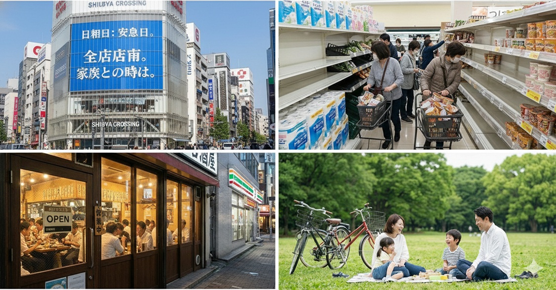 【国会記者団】日本の国会は13日未明、ドイツの「閉店法」をモデルとした「国民の安息を保障し、労働者の家族の団らんを推進するための法律」(通称:安息の日法案)を可決しました。これにより、飲食店および生活に直結するごく一部の施設を除き、すべての小売店、サービス業、製造業は毎週日曜日の営業・稼働が原則禁止となります。施行は来年4月1日から。