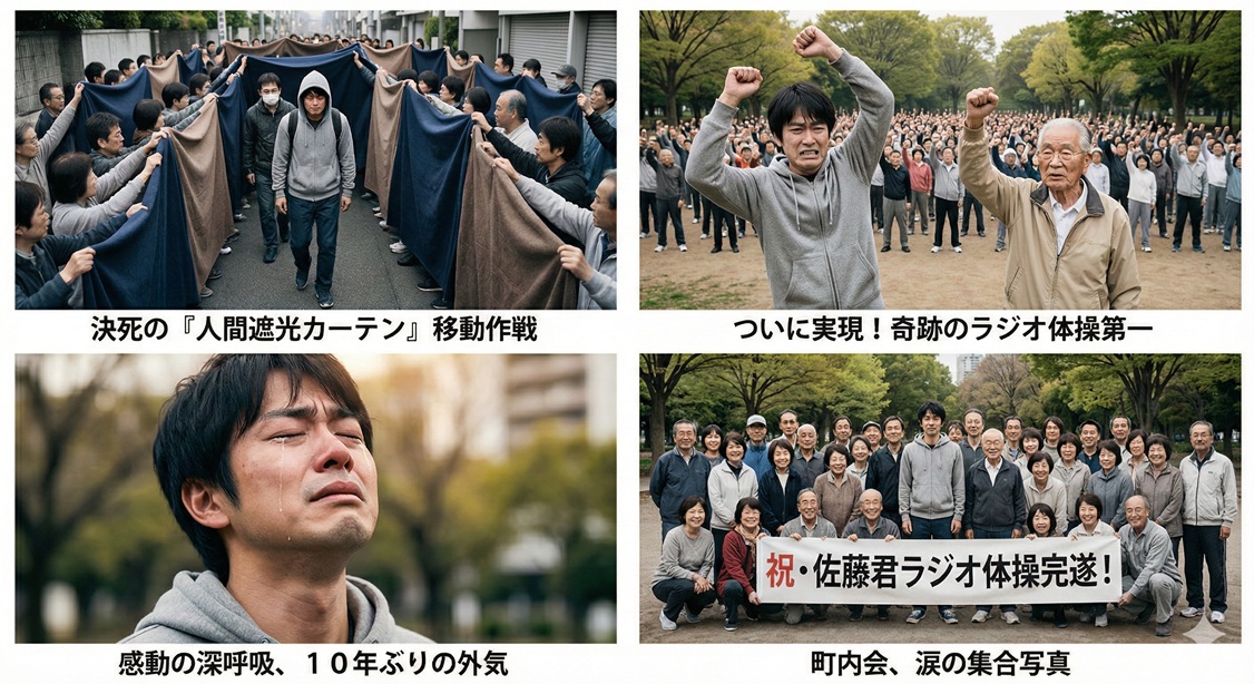 埼玉県さいたま市の「ひるなか公園」で18日早朝、10年間にわたり自宅にひきこもっていた佐藤さん(仮名・34)が、地域住民とともに「ラジオ体操第一」を最後までやり遂げるという歴史的な出来事があった。町内会が3年の歳月と総工費200万円を投じて準備した「ラジオ体操参加支援プロジェクト」が、ついに感動のフィナーレを迎えた。
