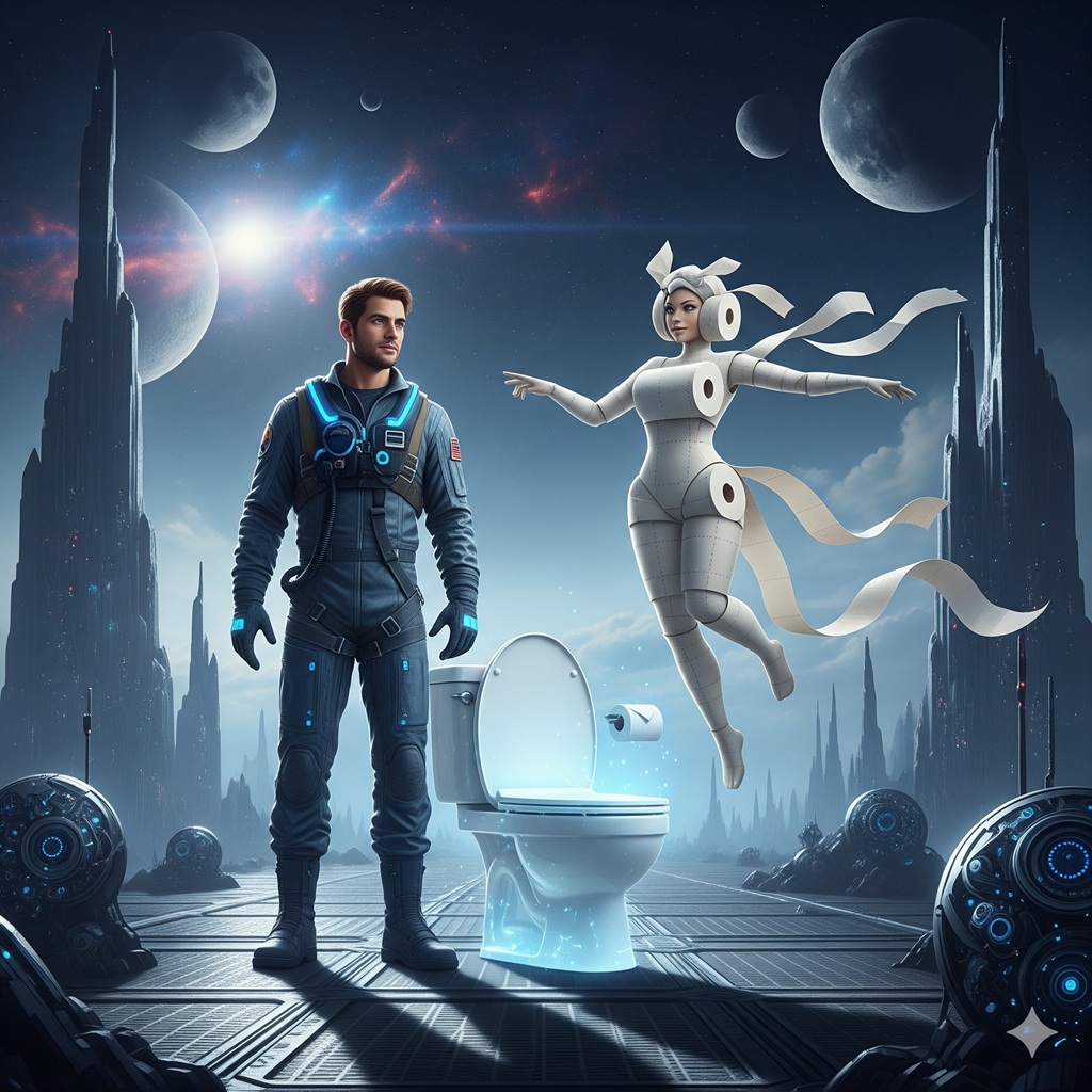 物語の主人公は、宇宙の果てを旅する孤独なパイロット、タロウ。彼の任務は、宇宙に散らばる「伝説のトイレ」を探すことでした。ある日、彼は古い宇宙ステーションで、不思議な光を放つトイレットペーパーの精霊ハナコと出会います。ハナコは、伝説のトイレの守り神であり、その場所への鍵を握っていました。