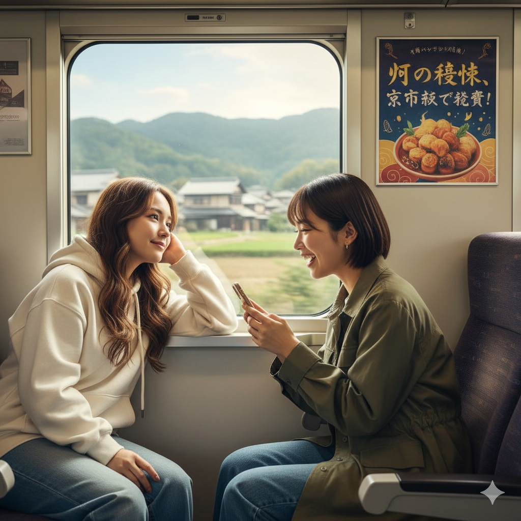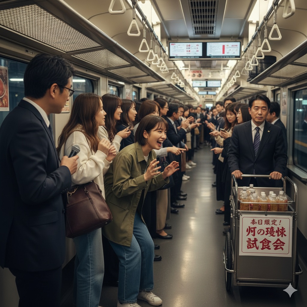 帰りの電車の中、A子と今日の出来事をあれこれ話していると、車内アナウンスが流れた。「ただいま、隣の車両で、本日限定の『幻の珍味』の試食会が行われております」。なんと、朝広告で見たあの珍味が、まさかこんなところで食べられるなんて!急いで隣の車両に向かうと、そこには長蛇の列が。試食には間に合わなかったけれど、今日の出来事を話す最高のネタができたとA子と笑い合った。