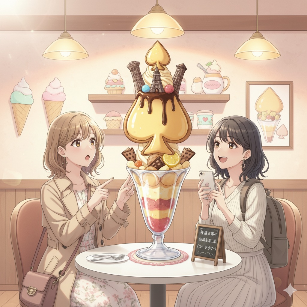 私たちはまたもや「創作(フェイク)」に遭遇してしまい、またもや大爆笑!「スペードタワーパフェ」は、見た目のインパクトだけでなく、プリンの濃厚な甘さが絶品でした。