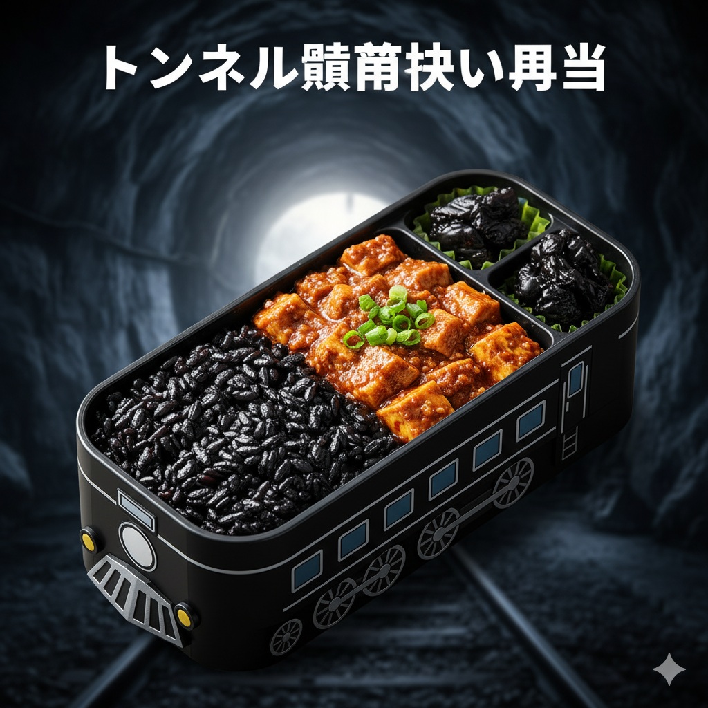 内容: トンネルの断面を模した真っ黒なイカ墨ご飯をメインに、発破作業をイメージした「爆発寸前の辛さ」の麻婆豆腐、そしてトンネル内で発見されたという設定の「謎の黒い漬物」(竹炭入り)を詰めた、見た目もインパクト大な一品。