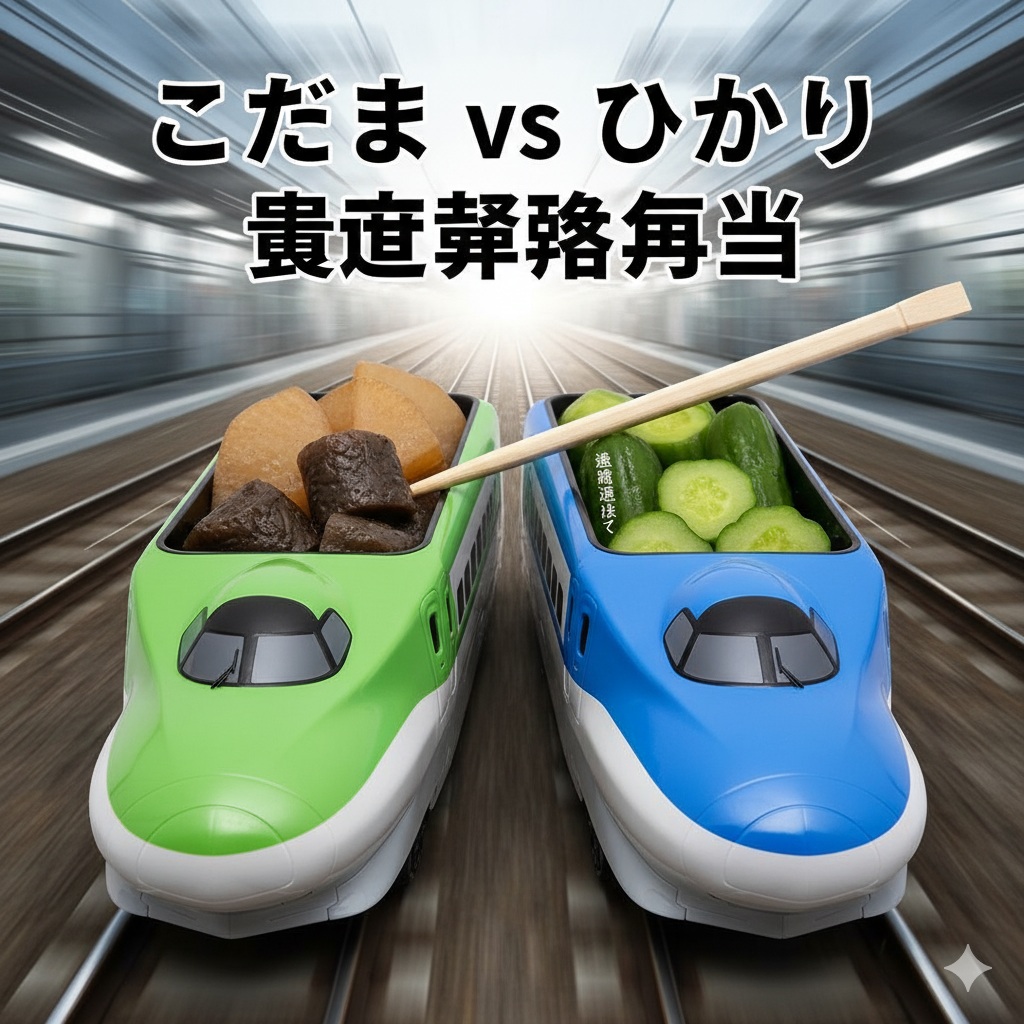 内容: 具材は「こだま(=ゆっくり)」をテーマに、じっくり煮込んだ大根や厚切りこんにゃくが中心。一方、付け合わせの「ひかり(=速い)」をテーマにした「超高速漬け込みキュウリ」(製造から30秒で完成)が、異様な速さで食欲を刺激する。