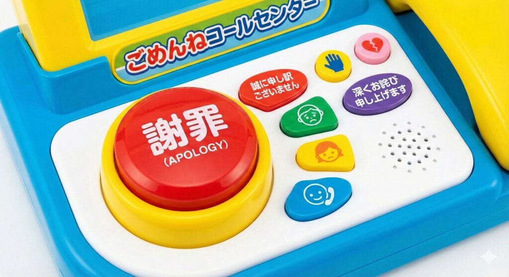 最大の目玉は、コンソール中央に配置された特大の「謝罪ボタン」です。これを押すと、「誠に申し訳ございません」「深くお詫び申し上げます」など、状況に応じた10種類の「定型謝罪フレーズ」がクリアな音声で再生されます。謝罪が苦手な現代の子供たちも、完璧な謝罪スキルを習得できると期待されています。