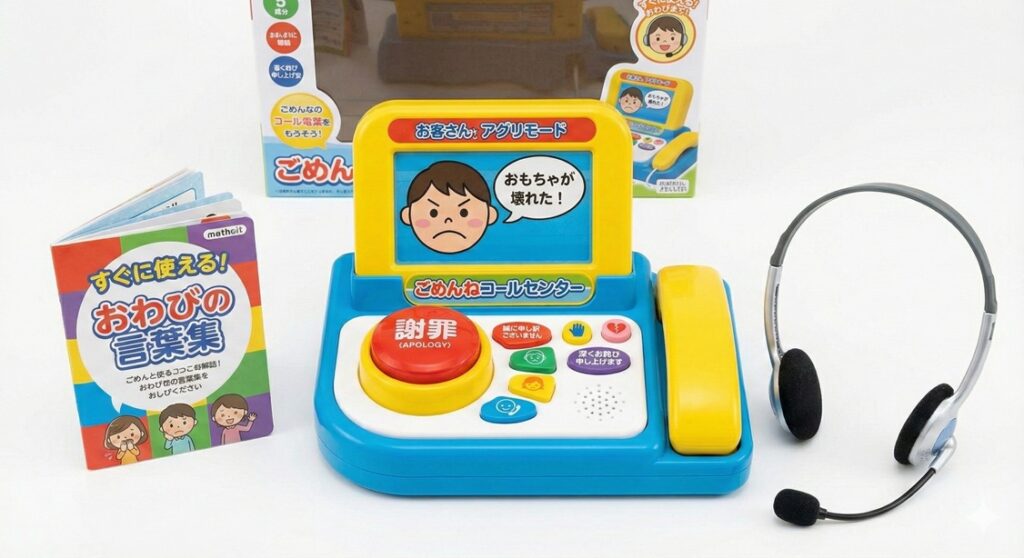 さらに、付属の「お客様おこりモード端末」には、保護者やきょうだいが実際にクレームの内容を録音できる機能がついています。「おもちゃが壊れた!」「お店の人が優しくなかった!」など、生活の中で遭遇した不満を録音。オペレーター役の子供は、その生々しいクレームを繰り返し再生し、冷静に対応する訓練ができます。