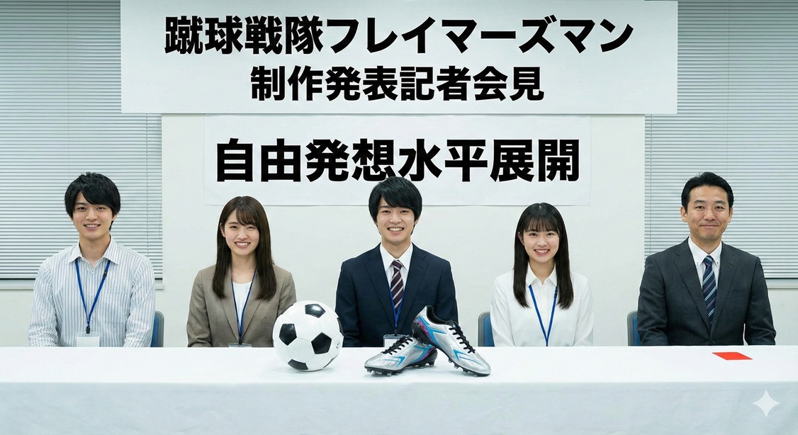 トーエー株式会社は本日、都内ホテルにて来季のスーパー戦隊シリーズ第60作となる『蹴球戦隊フレイマーズマン』の制作発表記者会見を行った。 従来の「正義対悪」という垂直的な対立構造を脱却し、「自由発想水平展開」をコンセプトに掲げた本作。地球の平和を守るだけでなく、地域密着型クラブチームとして「リーグ優勝」と「スタジアム経営の黒字化」も目指すという、特撮史上初の「運営型ヒーロー」が誕生する。