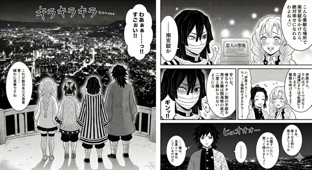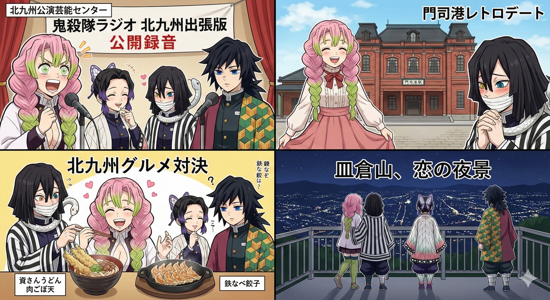 甘露寺蜜璃: 「まあまあ二人とも! 皿倉山の夜景を見れば、みんな仲良くなれるわよ! 北九州って本当に情熱的で素敵な街ね!」