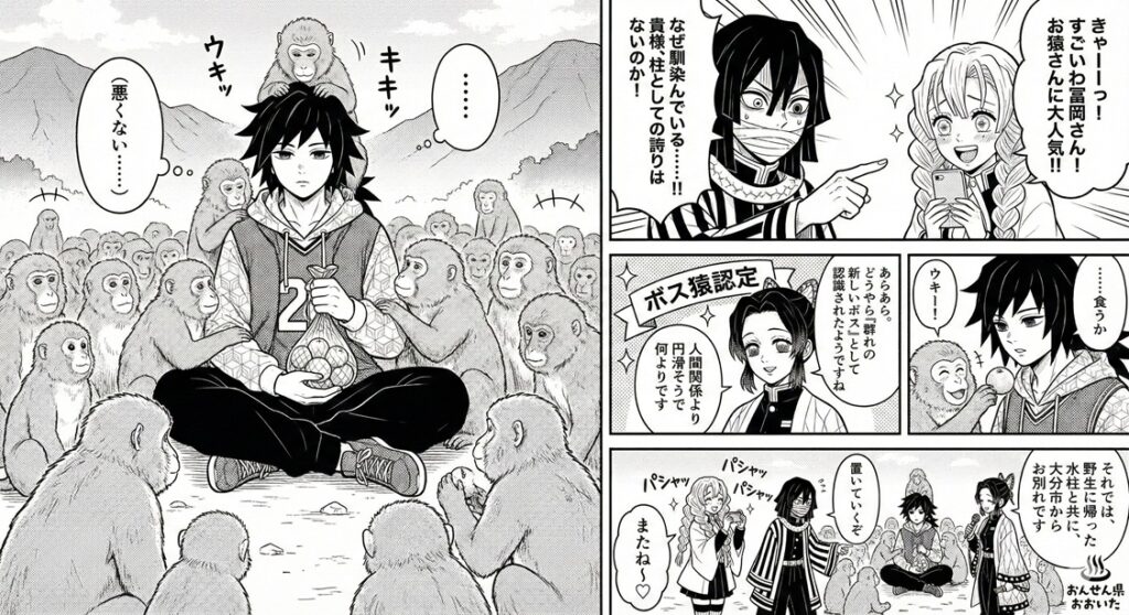 義勇: 「……(無言でサルにボス猿と間違われ、囲まれている)」