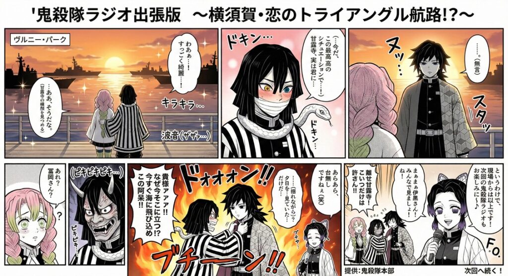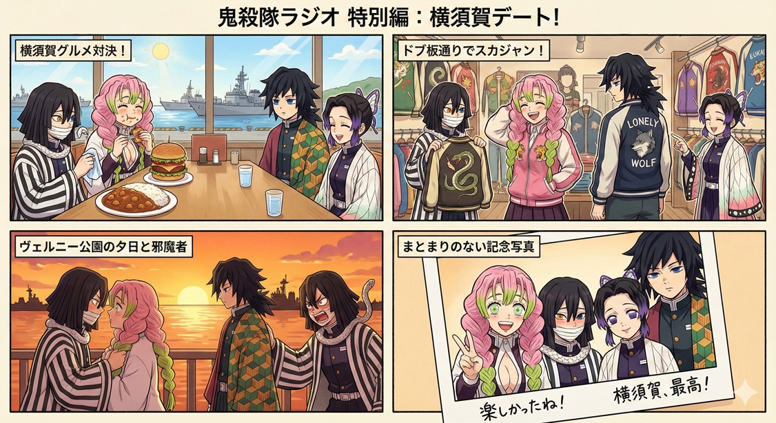 しのぶ 「あらあら、伊黒さん。今日は『鬼殺隊ラジオ・横須賀出張版』なんですから、仲良くしてくださいね。それに今日は、蜜璃さんの希望で『港町デート』というテイでお送りするんですから。」