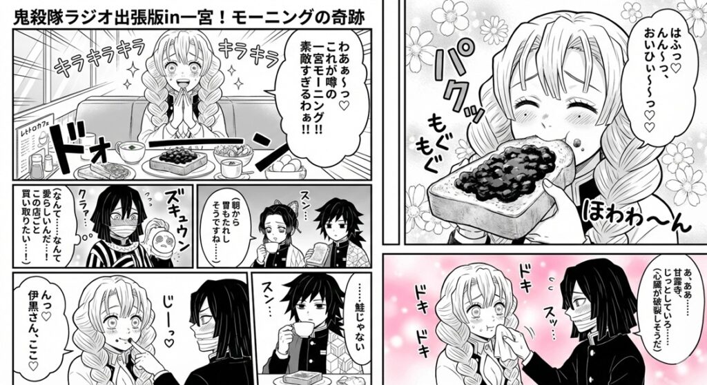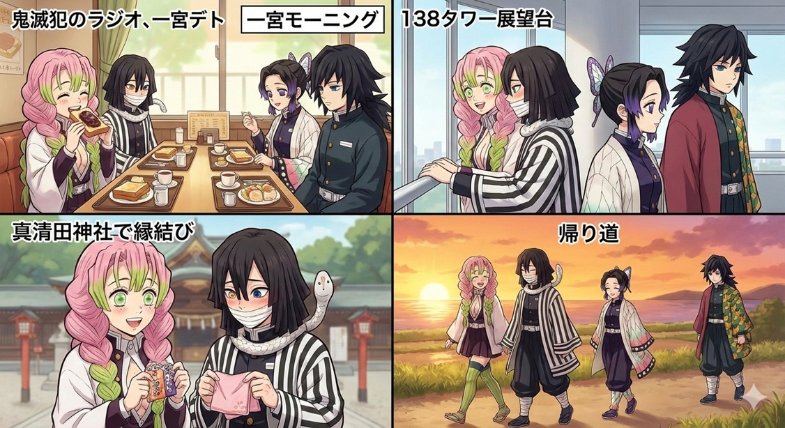 しのぶ: 「はい、始まりました『鬼殺隊ラジオ』出張版。本日は愛知県一宮市からお届けします。一宮といえば、喫茶店の『モーニング』発祥の地とも言われていますね。今日はこの4人で、一宮デートスポットを巡りたいと思います。こんばんは、胡蝶しのぶです」