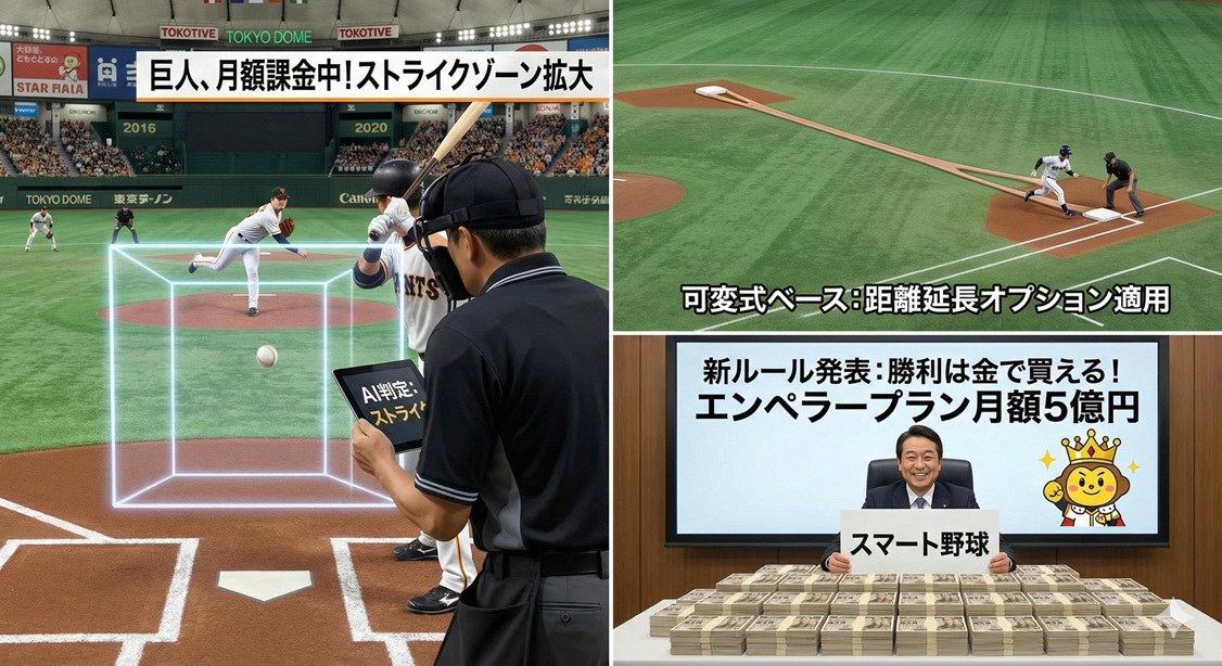 読売ジャイアンツは14日、来季の東京ドーム主催試合において、プロ野球界初となる画期的な新ルール「判定サブスクリプション(定額課金)制度」を導入すると発表した。月額料金を支払うことで、試合中の判定基準がチームに有利な形へ自動調整される仕組みで、球団経営の多角化と勝率向上の一石二鳥を狙う。