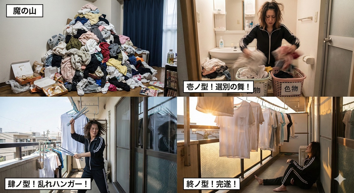 全ての洗濯物を干し終え、ベランダが色とりどりの衣類で埋め尽くされた時、佐藤さんは夕日に向かって「終ノ型! 完遂・部屋干し無用!」と高らかに宣言し、その場に崩れ落ちたという。