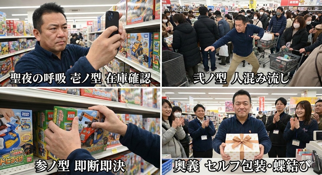 クリスマスを目前に控えた週末、激戦地と化した都内の家電量販店玩具売り場で、一人の父親が「聖夜(サンタ)の呼吸」と呼ばれる独自の呼吸法を会得し、見事に子供へのプレゼントを確保・包装まで完遂するという事案が発生した。専門家は「極限状態が生んだ奇跡だが、真似をすると店員に通報される恐れがある」と注意を呼びかけている。