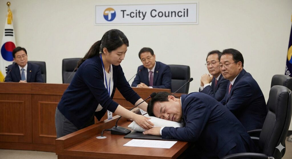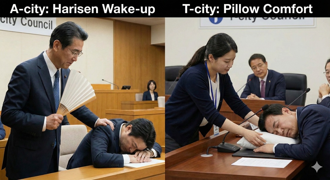 【A市】全国の自治体で初となる、ユニークな居眠り対策がお隣韓国のA市とT市でそれぞれ導入され、大きな話題を呼んでいます。A市は「居眠り議員ハリセン叩き起こし」という強硬策を、T市は「夢心地、そっとまくら持参」という対照的な“癒やし”戦略を採用。両市の議会運営のあり方が問われています。