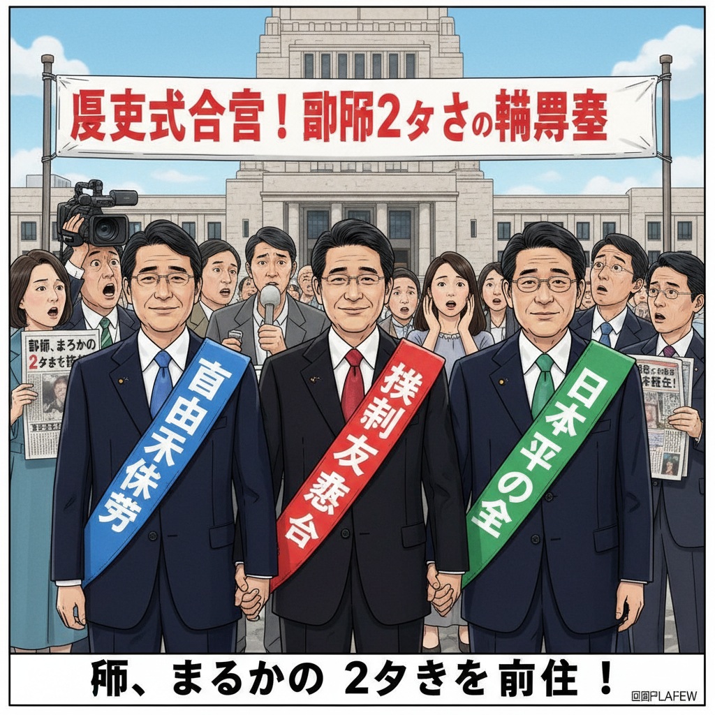 【永田町発】衆参両院で行われた首班指名選挙の結果を受け、先の選挙で議席が拮抗した「自由未来党」「革新友愛連合」及び「日本平和の会」の3党は、難航していた連立政権樹立に向け、異例の「首相2か月輪番制」を柱とする政策合意に達した。これにより、日本の総理大臣は今後、各党から順番に2か月間ずつ就任する形となり、「安定した政権運営」という従来の常識を根底から覆すことになった。