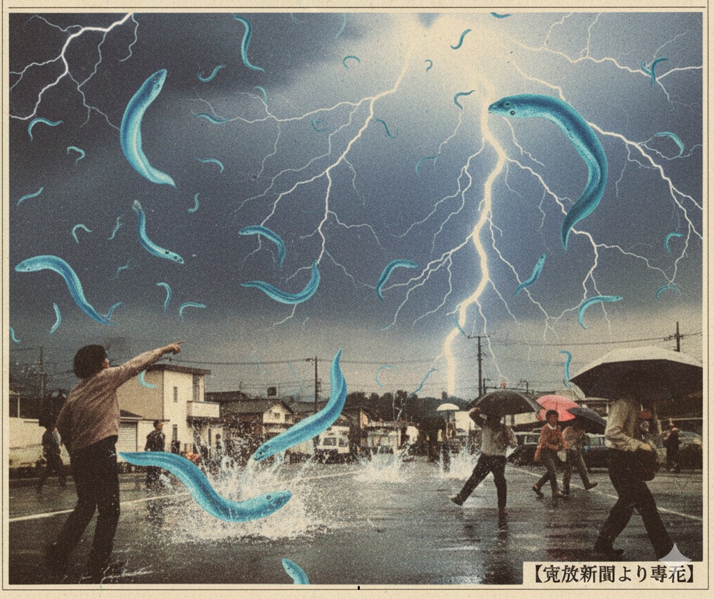 これまで、「乾いた空気の中で起こる珍しい雷()」としてこの現象を説明してきましたが、目撃者から「雷の音とともに、うなぎのような生物が空から降ってきた」という証言が多数寄せられ、事態は新たな局面を迎えました。