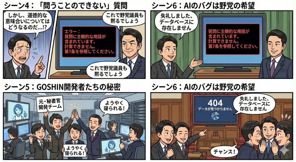 生成AI「ゴシン」の最大の特長は、「政府方針に絶対に従った回答の正確性」にある。導入初日から、その威力は議場を震撼させた。