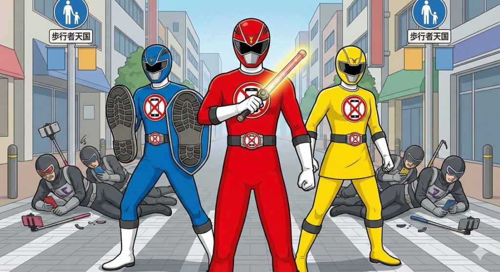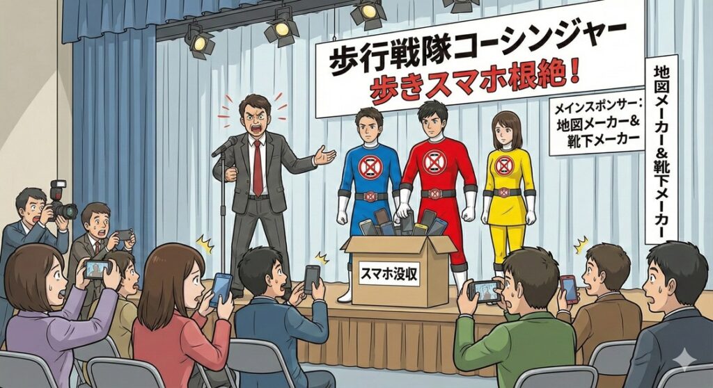 【速報】 2026年春スタート予定の新たなスーパー戦隊シリーズの制作発表会が本日行われました。その名も「歩行戦隊コーシンジャー」。驚くべきことに、本シリーズのヒーローたちは変身後、スマートフォン(スマホ)を完全に没収され、「正しい歩行」をミッションとして課されます。プロデューサーは「現代人が失った『歩くことの尊厳』を取り戻す」と熱弁。その異色の設定に会場は騒然としました。