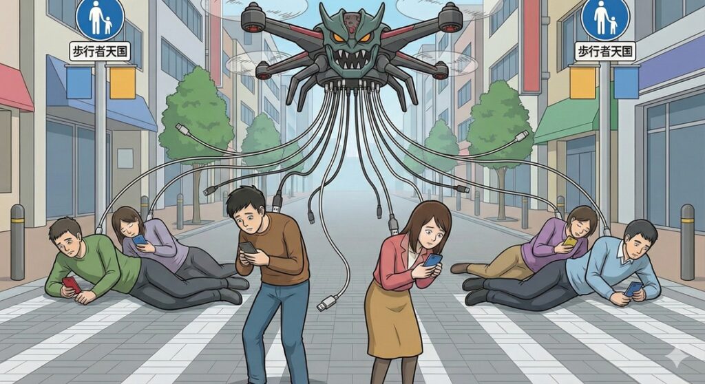 - 人々を上空から監視し、立ち止まっている人を見つけると、強制的に「充電ケーブル地獄」に繋ぎ止める。
