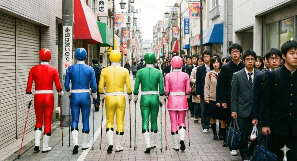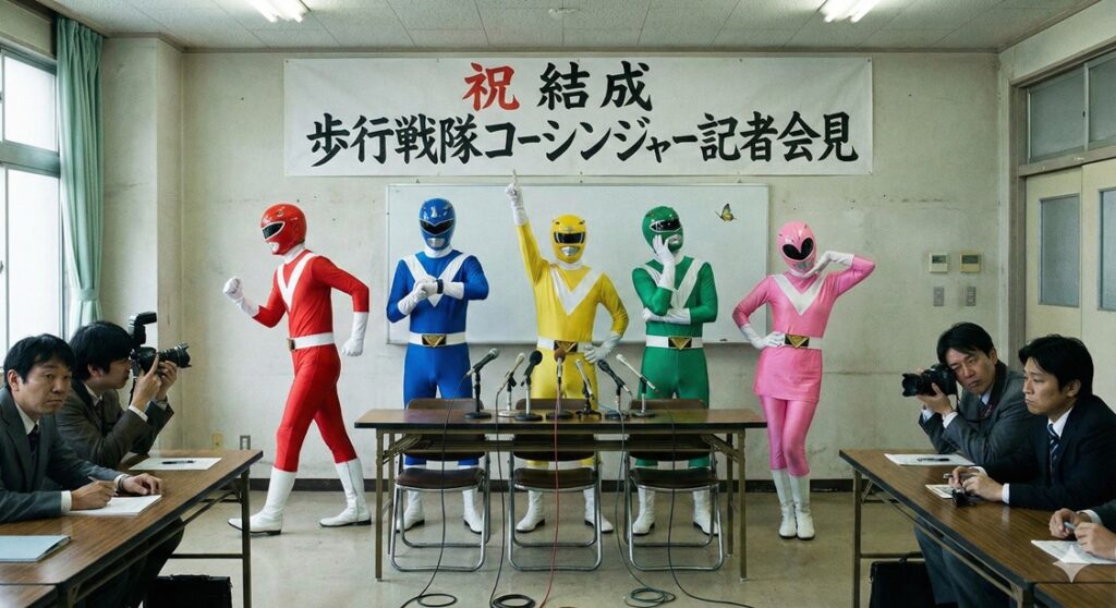 全員:「我々は歩行戦隊コーシンジャー! 笑顔の道をウォークオン!……あ、グリーンが蝶々を追いかけてどこかに行きました! すみません、会見は以上です! 捜索(徒歩)に行きます!」