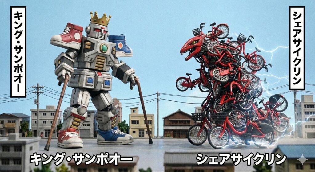 - 街中のレンタル自転車を合体させた怪獣。電動アシスト機能で坂道をスイスイ登り、人力のイエローを精神的に追い詰める。