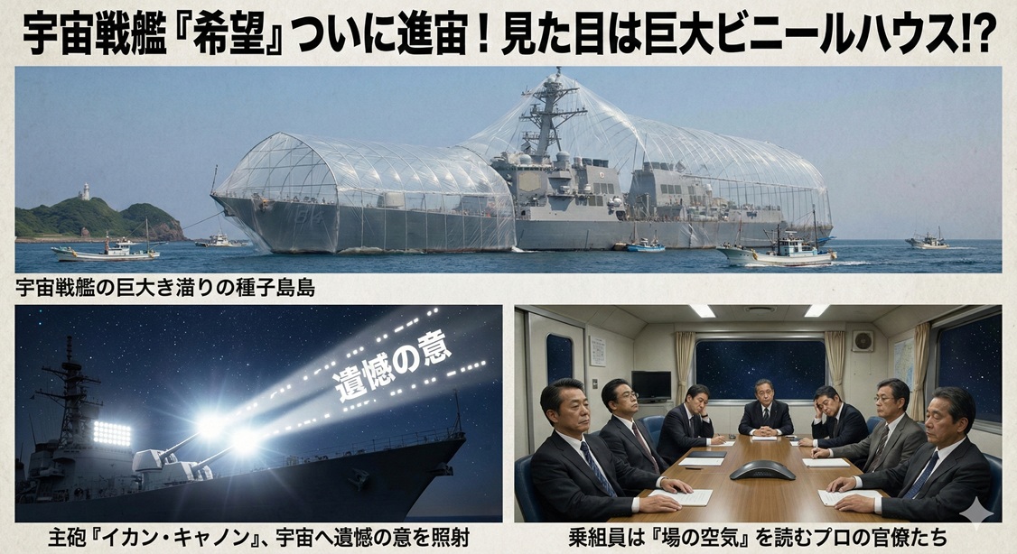 初代艦長に就任した元・霞が関勤務の男性(58)は、「宇宙には空気がないが、我々は空気(場の空気)を読むことにかけてはプロだ。銀河の平和を、定時退庁の範囲内で守り抜きたい」と抱負を語った。