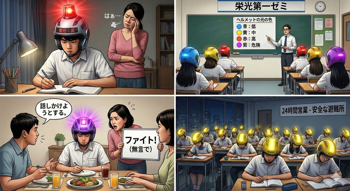 ある受験生の母親は「夕食時に『頑張ってるね』と声をかけただけで、ヘルメットが爆発寸前の紫色に点滅した。それ以来、家では筆談しかしていません」と語る。