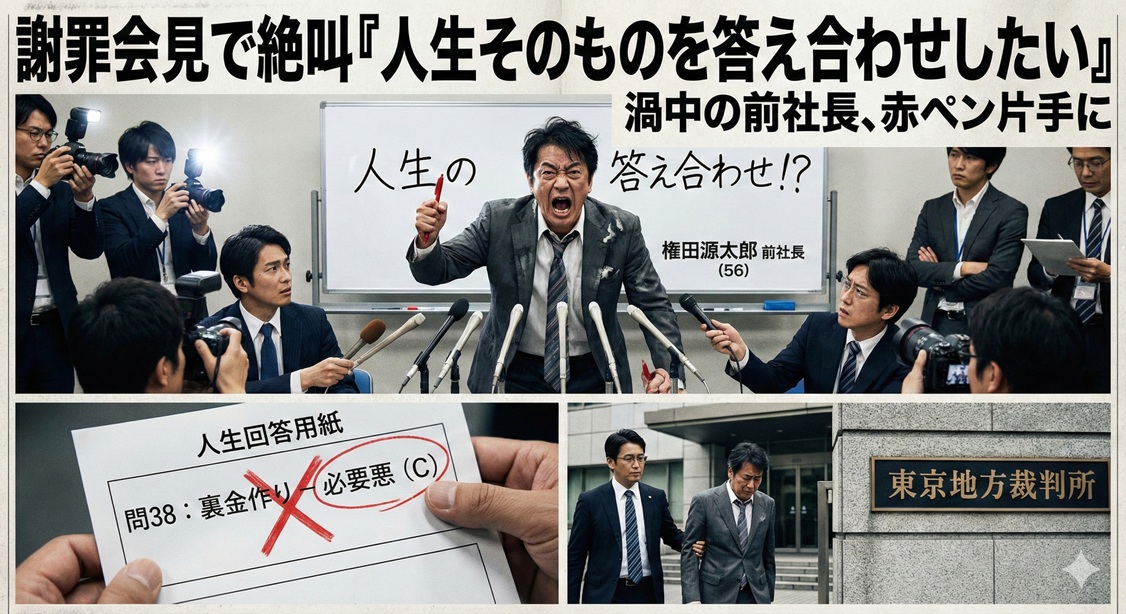 権田氏は懐から採点用の赤ペンを取り出すと、自身のこれまでの経営判断を「試験問題」に例えて持論を展開し始めた。「例えば問38の『裏金作り』。私はこれを『必要悪』という選択肢でマークしたが、世間はバツだと言う。でも、本当にそうか? 引っかけ問題じゃないのか? 解説冊子を見ないと納得できない」と主張。さらに、「問42の『愛人契約』についても、配点が高すぎる気がする」などと、自身の不祥事をあくまでテストの回答ミスとして処理しようとする姿勢を見せた。