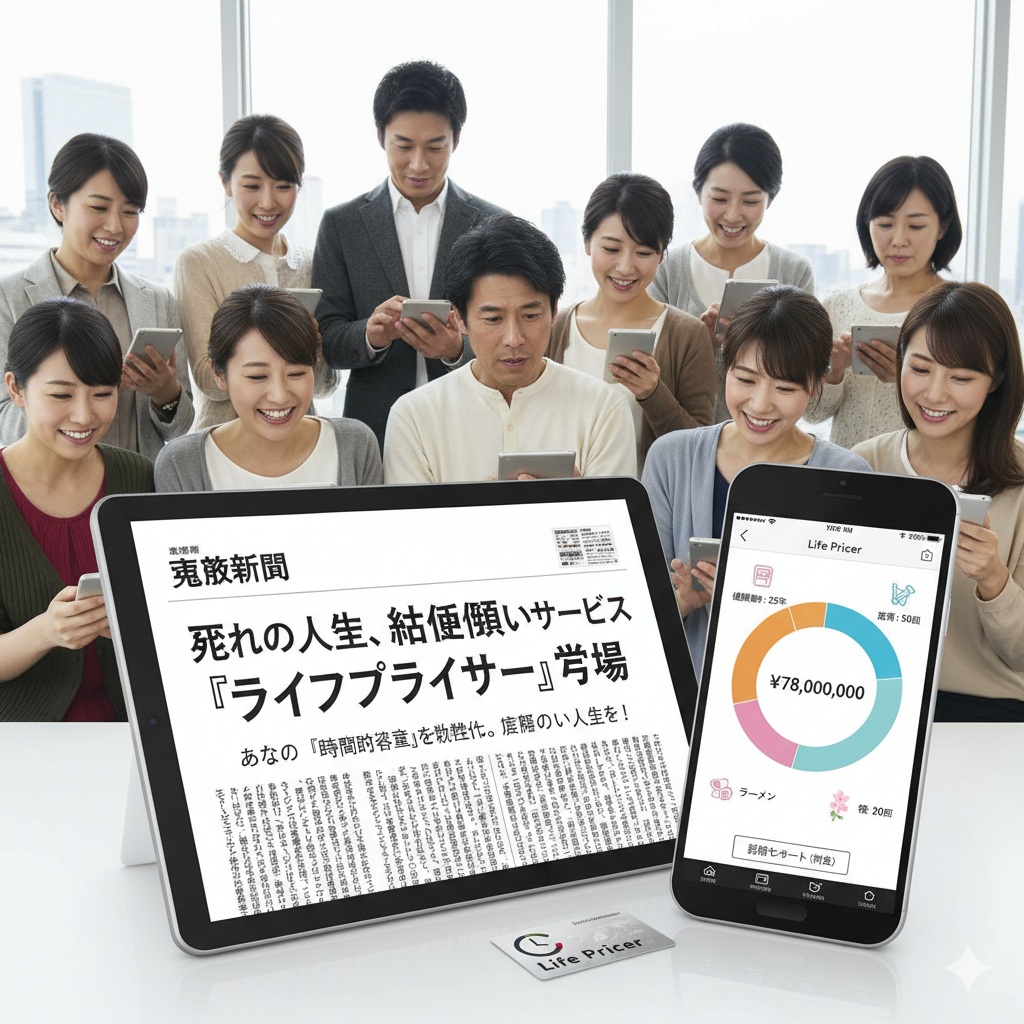 【速報】株式会社未来予測テクノロジーズ(本社:東京都渋谷区)は、この度、画期的な新サービス「ライフプライサー」の提供を開始すると発表しました。これは、不動産一括見積もりの仕組みを応用し、ユーザーの「残りの人生」を数値化して一括で査定する、世界初のサービスです。