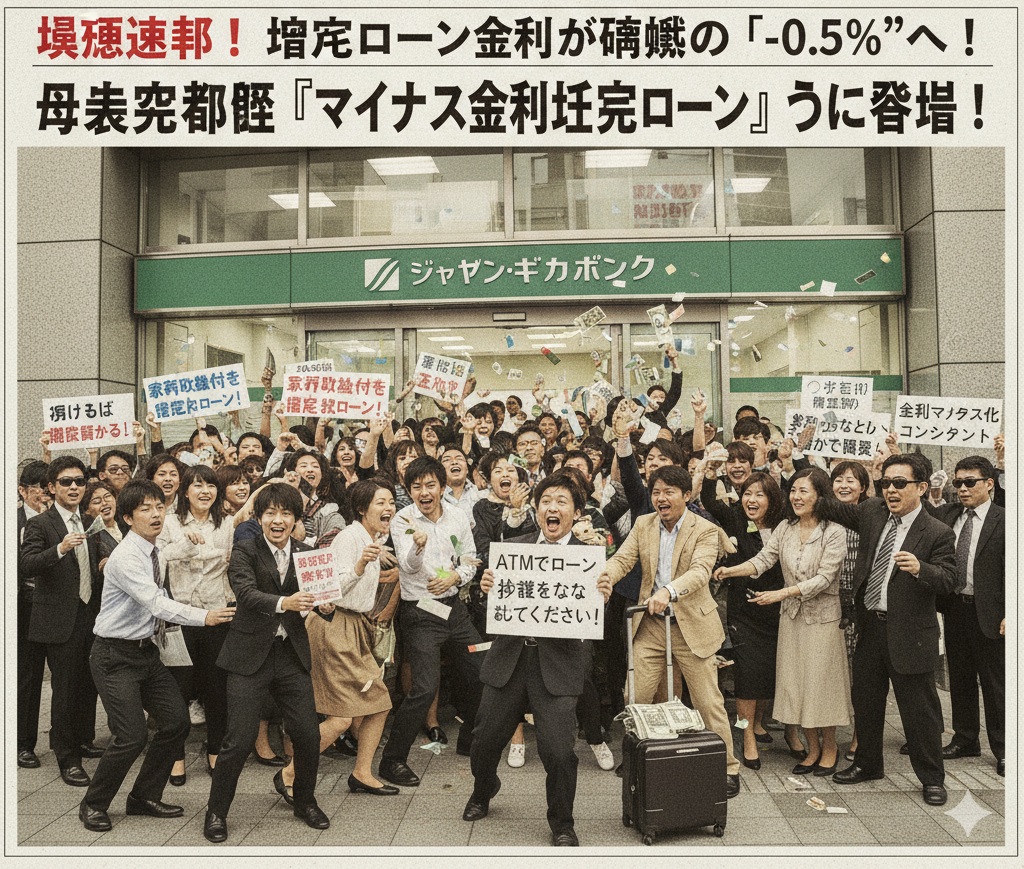 【東京】長引く超低金利時代に、ついに金融の常識が崩壊しました。国内最大手銀行グループ「ジャパン・ギガバンク」は本日、住宅ローンの新たな金利体系を発表。その優遇適用後の金利は、驚くべきことに「年マイナス0.5%」となりました。